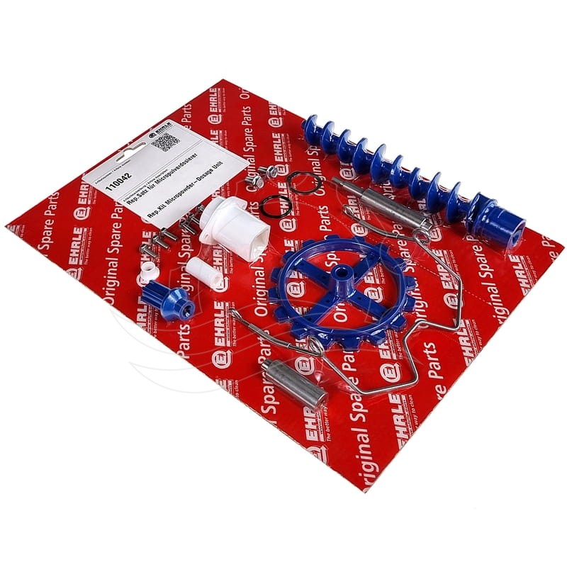 Kompletny podajnik mikroproszku produkcji Ehrle. Zestaw zawiera: ślimak plastikowy, koło mieszające, sprężynę koła, dzióbek, uszczelkę, pierścień Segera i śruby.