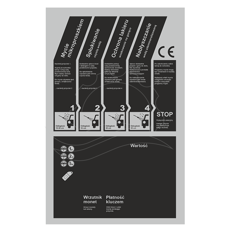 Naklejka na panel wiszący myjni Ehrle starego typu. Wersja z 4 klasycznymi programami: mycie, spłukiwanie, woskowanie, nabłyszczanie-osuszanie. Wzór stworzony na podstawie oryginalnego nadruku producenta. Naklejka opisuje przyciski programu i urządzenia do przyjmowania płatności. Wymiar 556x867mm. Wydruk na folii polimerycznej zabezpieczonej laminatem matowym lub błyszczącym.