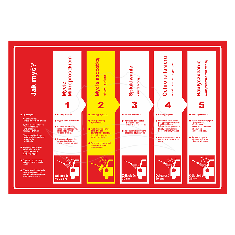 Naklejka na drzwi myjni Ehrle starego typu. Wersja z 5 programami: mycie mikroproszkiem, mycie szczotką, spłukiwanie, woskowanie, nabłyszczanie-osuszanie. Naklejka stanowi instrukcję mycia pojazdu. Wymiar 845x595mm. Wydruk na folii polimerycznej zabezpieczonej laminatem matowym lub błyszczącym.