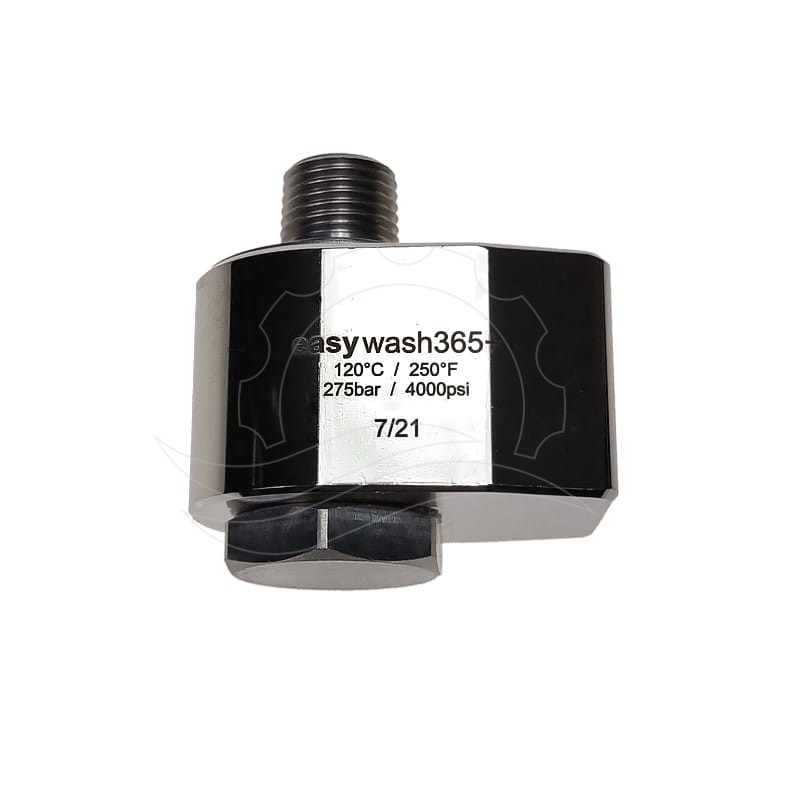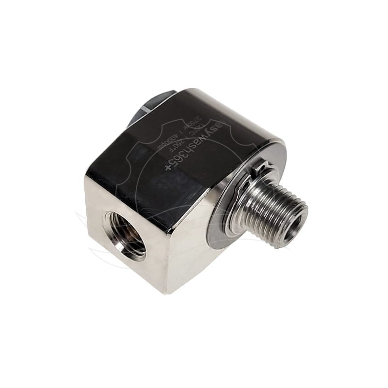 Kątowe złącze obrotowe Easywash365+ G3/8''F-G1/4''M. Obudowa z niklowanego mosiądzu. Oś ze stali nierdzewnej o średnicy przepływu 7mm. Ciśnienie max 275bar, temperatura max 120°C.