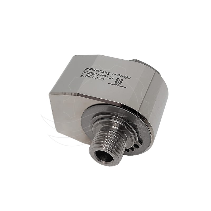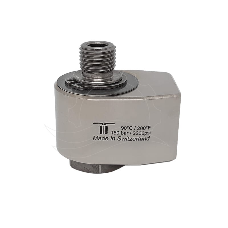Kątowe złącze obrotowe Mosmatic WDG G1/4''F-G1/4''M. Obudowa z niklowanego mosiądzu. Oś ze stali nierdzewnej o średnicy przepływu 7mm. Ciśnienie max 150bar, temperatura max 90°C.